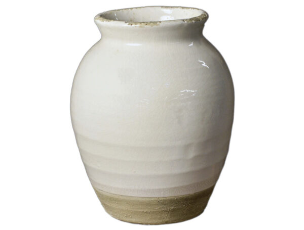 This stoneware vase is made to have an antique look. The natural raw stoneware colour featured at the base paired with the ivory finish that covers the rest of the vase, creates a lovely neutral colour contrast.